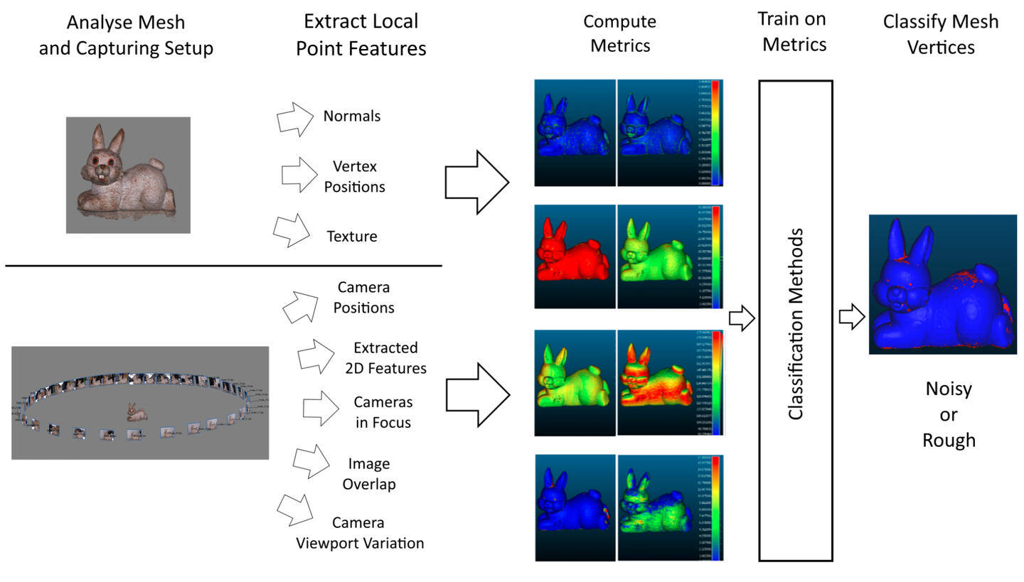 Structure from Motion (SfM) can produce highly detailed 3D reconstructions, but distinguishing real surface roughness from reconstruction noise and geometric inaccuracies has always been a difficult problem to solve. Existing SfM commercial solutions achieve noise removal by a combination of aggressive global smoothing and the reconstructed texture for smaller details, which is a subpar solution when the results are used for surface inspection. Other noise estimation and removal algorithms do not take advantage of all the additional data connected with SfM. We propose a number of geometrical and statistical metrics for noise assessment, based on both the reconstructed object and the capturing camera setup. We test the correlation of each of the metrics to the presence of noise on reconstructed surfaces and demonstrate that classical supervised learning methods, trained with these metrics can be used to distinguish between noise and roughness with an accuracy above 85%, with an additional 5–6% performance coming from the capturing setup metrics...