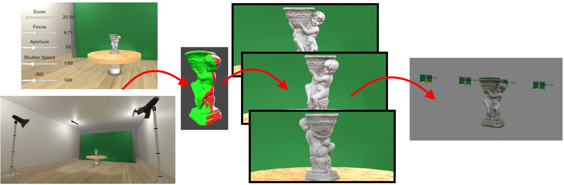 In recent years 3D reconstruction has become an important part of the manufacturing industry, product design,digital cultural heritage preservation, etc. Structure from Motion (SfM) is widely adopted, since it does not require specialized hardware and easily scales with the size of the scanned object. However, one of the drawbacks of SfM is the initial time and resource investment required for setting up a proper scanning environment and equipment, such as proper lighting and camera, number of images, the need of green screen, etc, as well as to determine if an object can be scanned successfully. This is why we propose a simple solution for approximating the whole capturing process. This way users can test fast and effortlessly different capturing setups.We introduce a visual indicator on how much of the scanned object is captured with each image in our environment, giving users a better idea of how many images would be needed. We compare the 3D reconstructioncreated from images from our solution, with ones ated from rendered images using Autodesk Maya and V-Ray. We demonstrate that we provide comparable reconstruction accuracy at a fraction of the time.