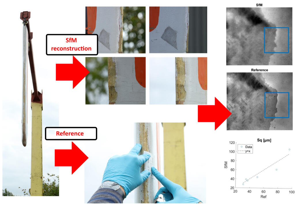 Over time, erosion of the leading edge of wind turbine blades increases the leading-edge roughness (LER). This may reduce the aerodynamic performance of the blade and hence the annual energy production of the wind turbine. As early detection is key for cost-effective maintenance, inspection methods are needed to quantify the LER of the blade. The aim of this proof-of-principle study is to determine whether high-resolution Structure-from-Motion (SfM) has the sufficient resolution and accuracy for quantitative inspection of LER. SfM provides 3D reconstruction of an object geometry using overlapping images of the object acquired with an RGB camera. Using information of the camera positions and orientations, absolute scale of the reconstruction can be achieved. Combined with a UAV platform, SfM has the potential for remote blade inspections with a reduced downtime. The tip of a decommissioned blade with an artificially enhanced erosion was used for the measurements...